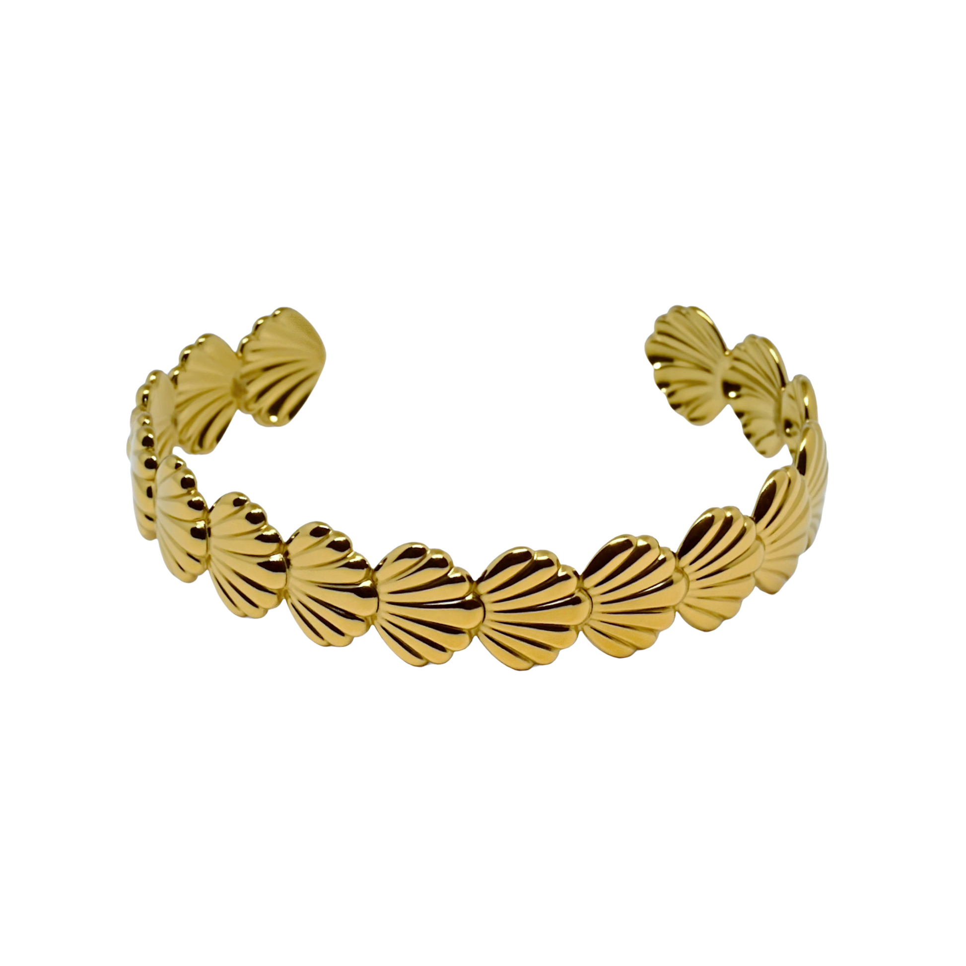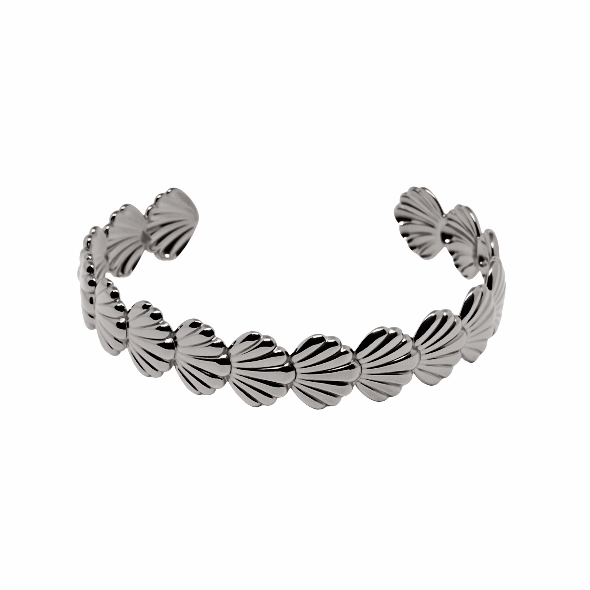 Een zilveren of gouden stalen armband met schelpen. Je kunt de armbanden gemakkelijk buigen om deze zo passend te maken om je eigen pols.
