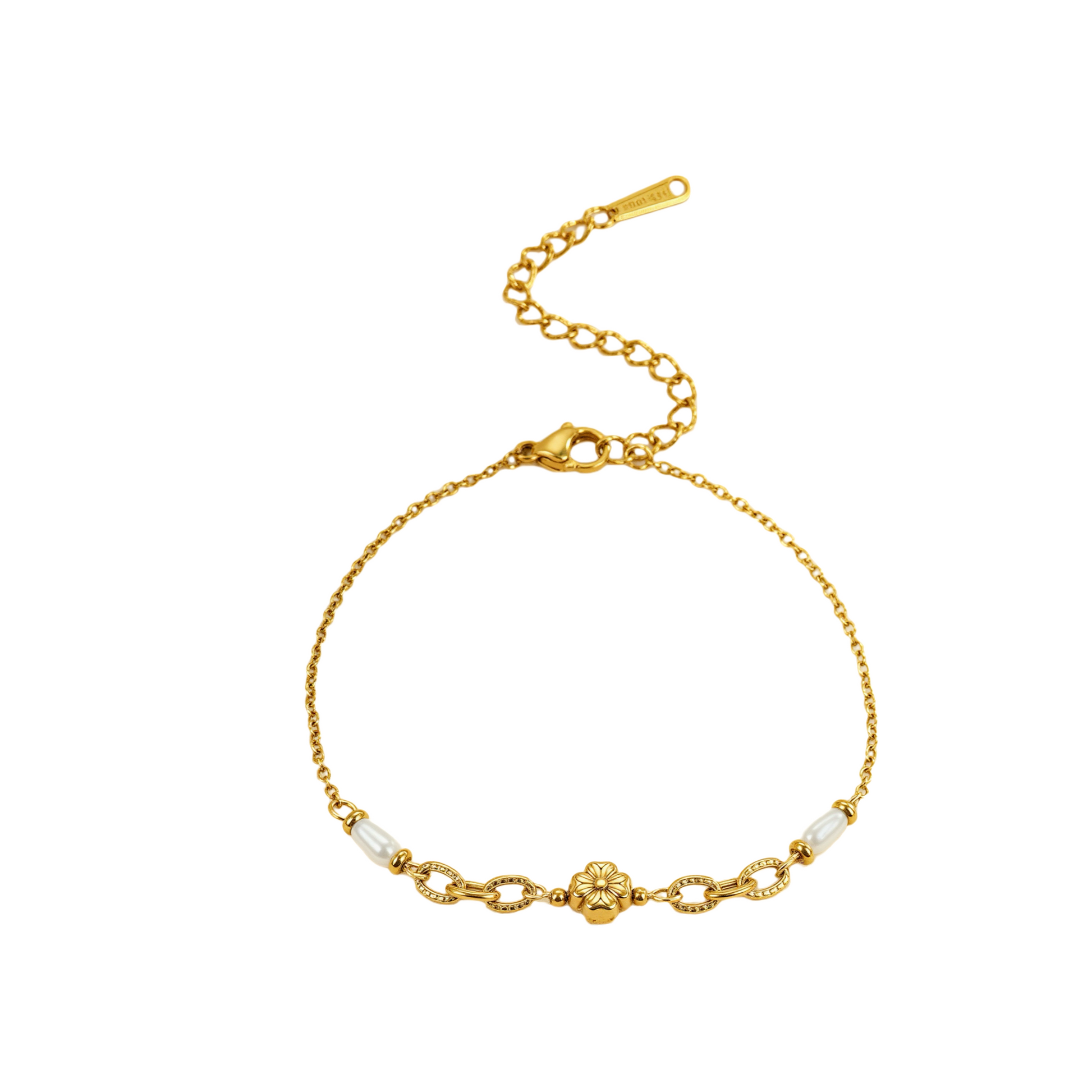 Een leuk armbandje met een bloemetjes bedel in het midden met parel details. Combineer deze gemakkelijk met verschillende armbandjes voor een complete look.