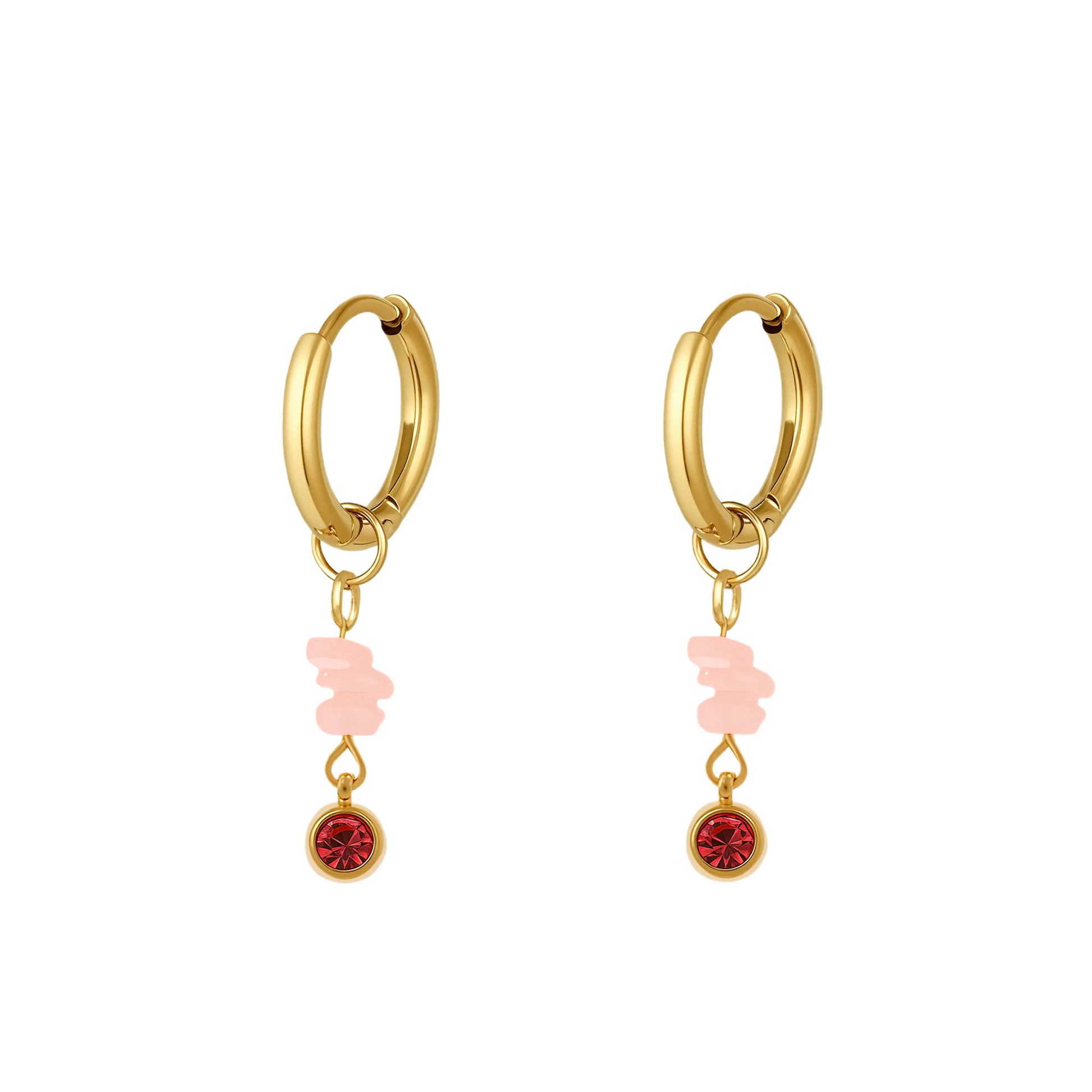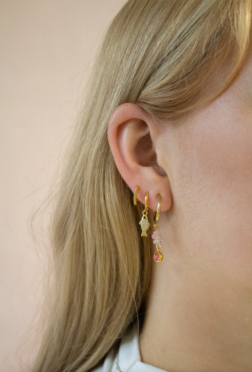 Mooie hoops met rozenkwarts steentjes en een donkerroze zirkonia steen. Draag deze oorbellen om je outfit mee op te vrolijken! Of om ze te combineren met meerdere gaatjes.