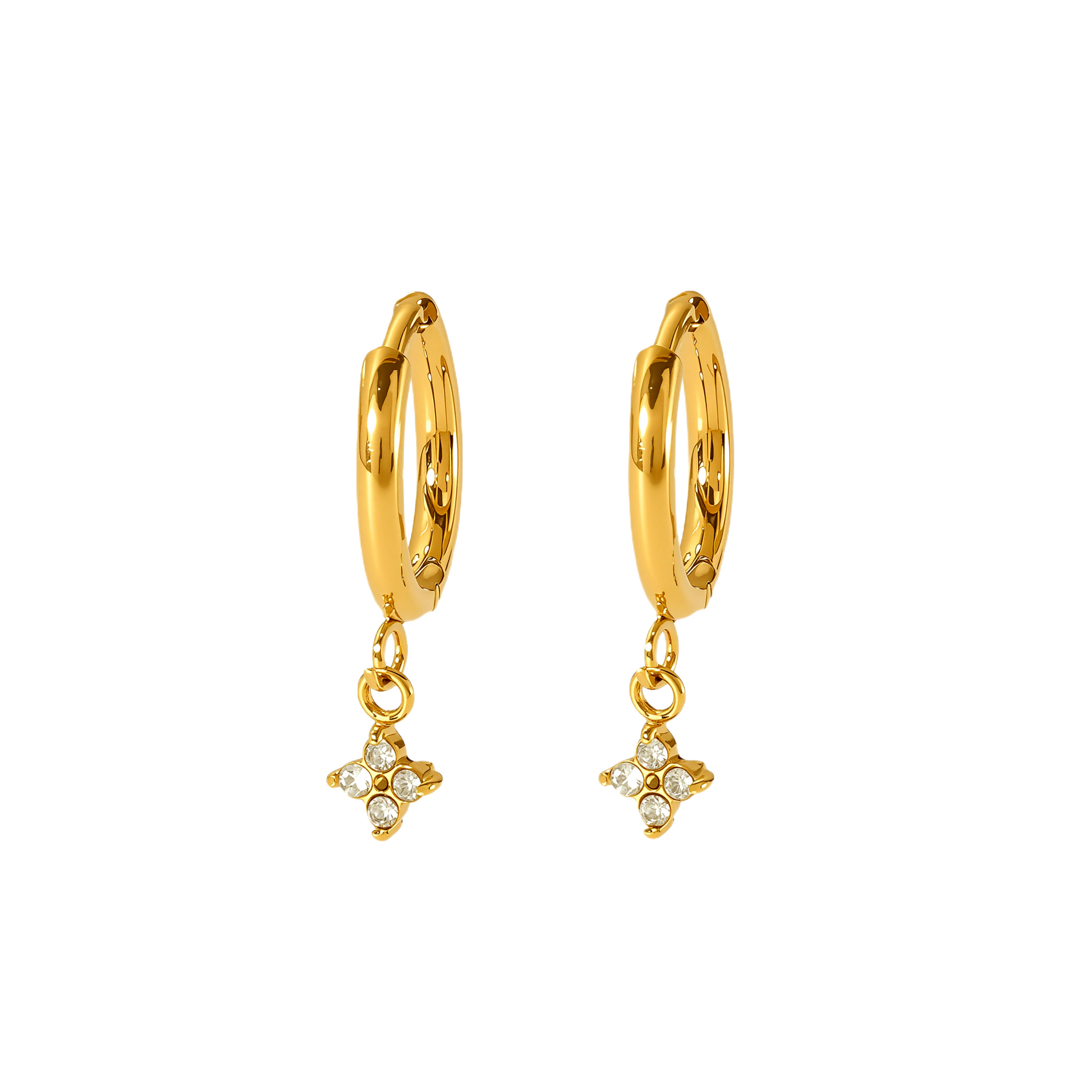 Mooie hoops met een bloemetjes bedel gevuld met kleine zirkonia diamantjes. Draag deze oorbellen om je outfit mee op te vrolijken! Of om ze te combineren met meerdere gaatjes.